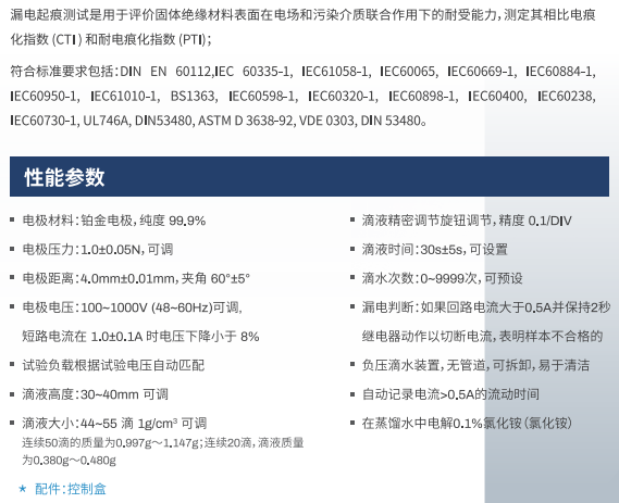 漏電起痕測試是用于評(píng)價(jià)固體絕緣材料表面在電場和污染介質(zhì)聯(lián)合作用下
